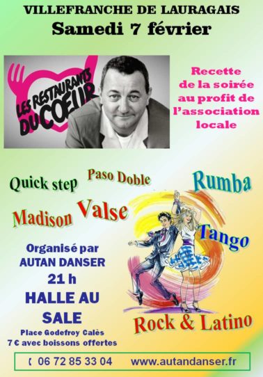 « Autan Danser » organise une soirée avec toutes les danses habituelles que vous pratiquez, Danses de salon, en ligne, Rock, Latino à la salle habituelle. La recette de la soirée sera au profit des bénéficiaires de l’association locale des Restos de Coeur.